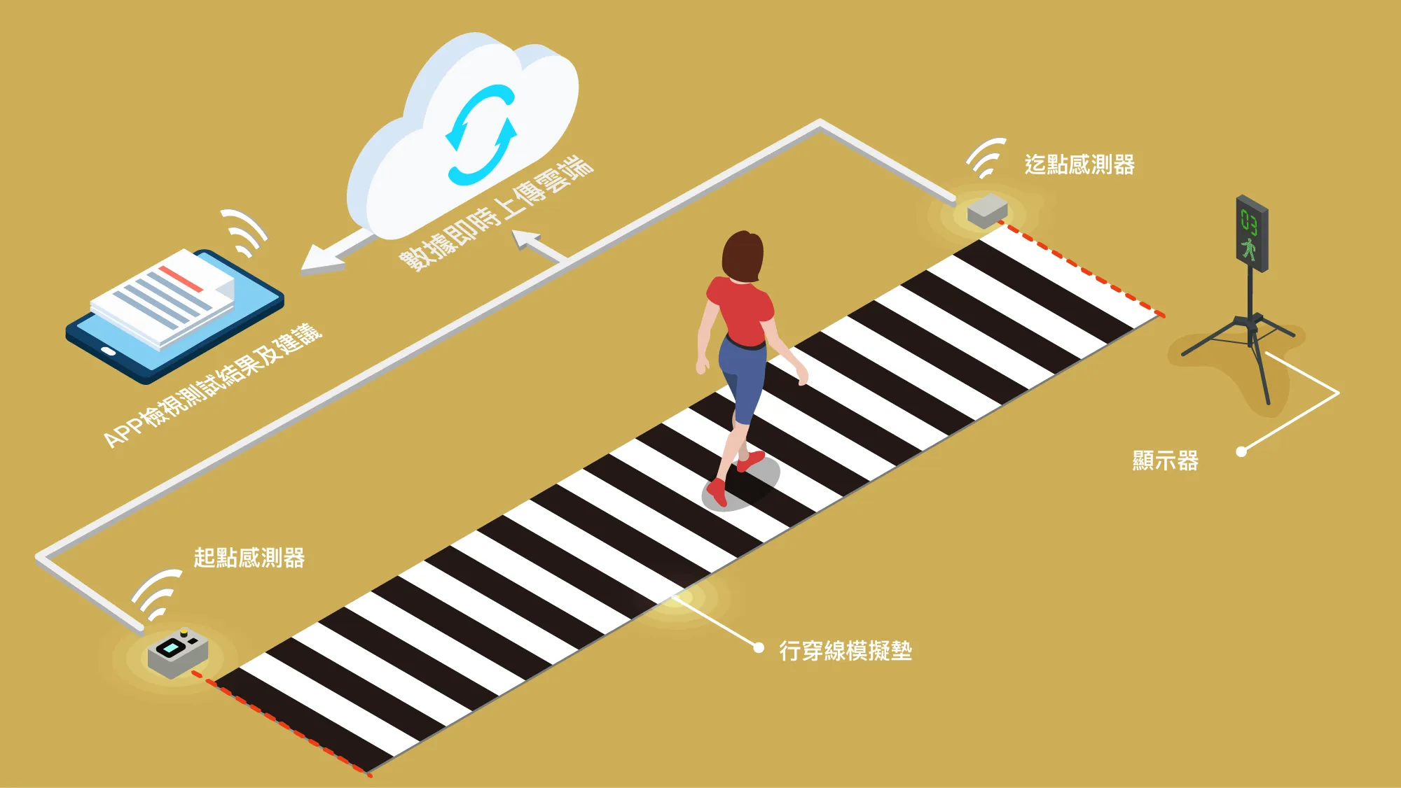 測試前只需輸入受測者基本資料,完成後即自動產出每位測試者步行分析報告 (行走秒數、步行速度、建議秒數等數據),資料上傳至雲端整合,供分析人員做為擬定行人相關交通應用時的依據,使用者亦可使用手機APP連線即時觀看測試結果。不管是交通單位要做為一般行人步行速度數據蒐集,或是到各機關學校等場所做為交通學習的教具,都非常適合。
